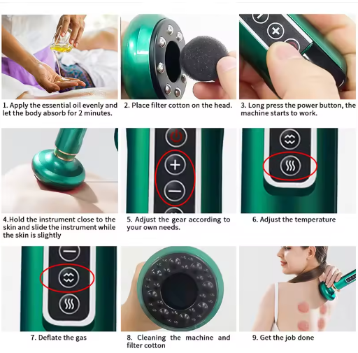 محرّك الجهاز بحركات طولية مستقيمة على المنطقة (من الأسفل إلى الأعلى) لمدة 10-15 دقيقة ، مع ضبط قوة الشفط أو الاهتزاز حسب راحتك.